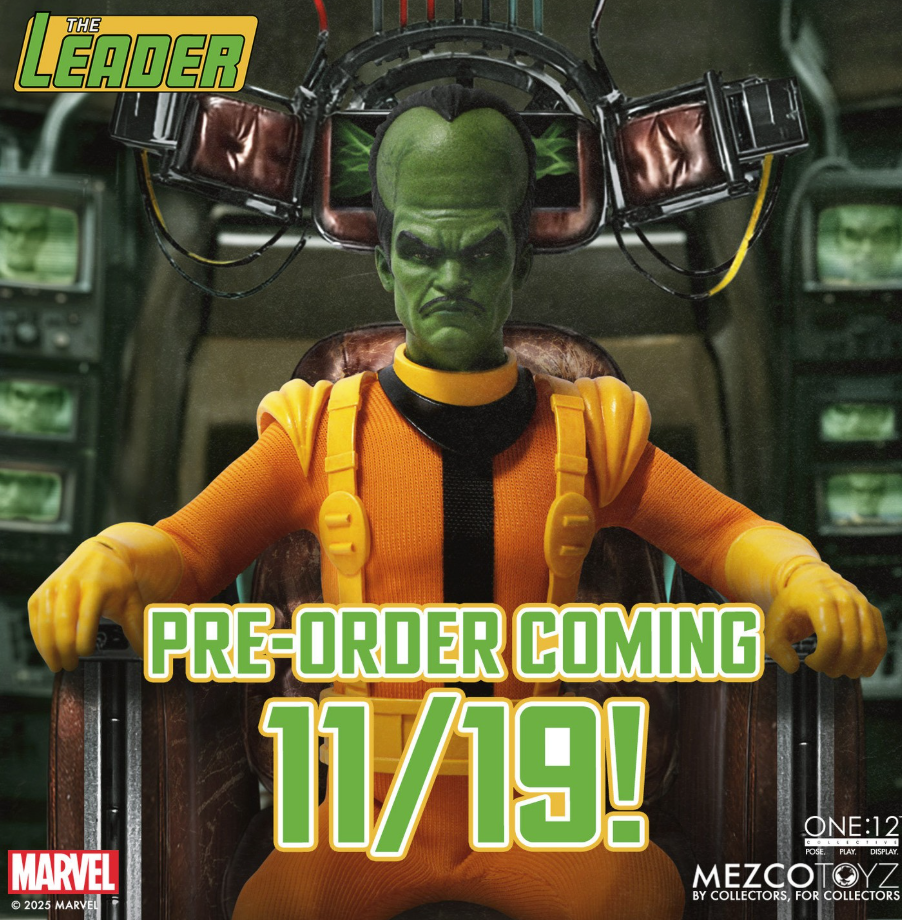 The One:12 Collective - The Leader features three interchangeable head portraits capturing his calculating expressions, from a sinister grin to rage-fueled determination. Outfitted in his comic-accurate battle suit, The Leader comes equipped with a psionic amplifier headband, laser pistol and his signature gamma ray blaster connected by a flexible wire to a control headset. Multiple interchangeable hands allow him to command, manipulate, and outthink any opponent.